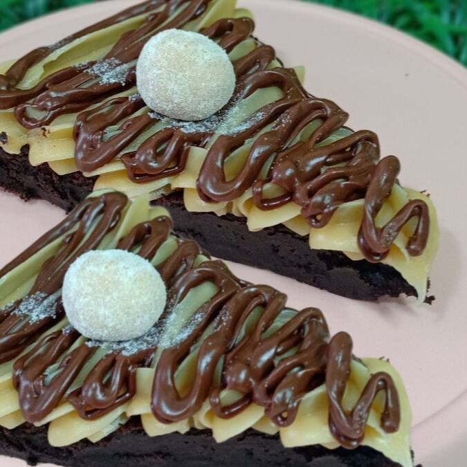 Duas fatias do melhor brownie da região com a cobertura de um cremoso brigadeiro de Ninho e finalizado com bastante Nutella.
