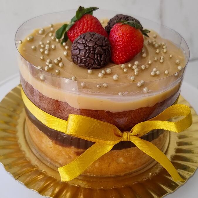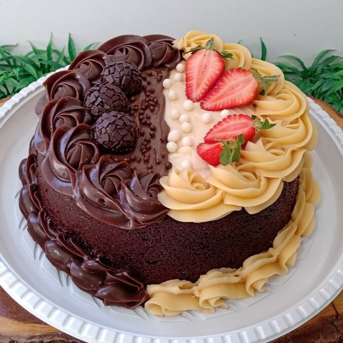 Um bolo para ocasiões especiais. Com massa branca ou mista bem úmida que derrete na boca, recheio cremoso de brigadeiro 50% e cobertura de brigadeiro cremoso de Ninho, finalizado com morangos e brigadeiro enrolados.