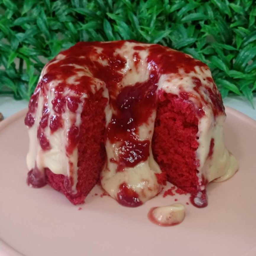 Caseirinho com Massa de red Velvet e cobertura de creme de ninho e geleia artesanal de morango. Serve 1 pessoa. Peso aproximado 430 g