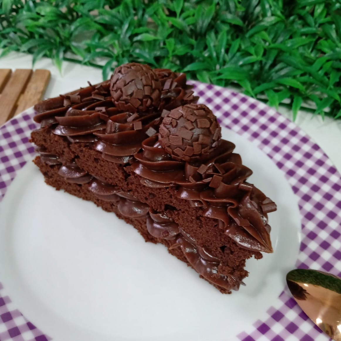Duas deliciosas fatias de bolo com sabor intenso de chocolate e textura bem fofinha, e cobertura e recheio de brigadeiro.