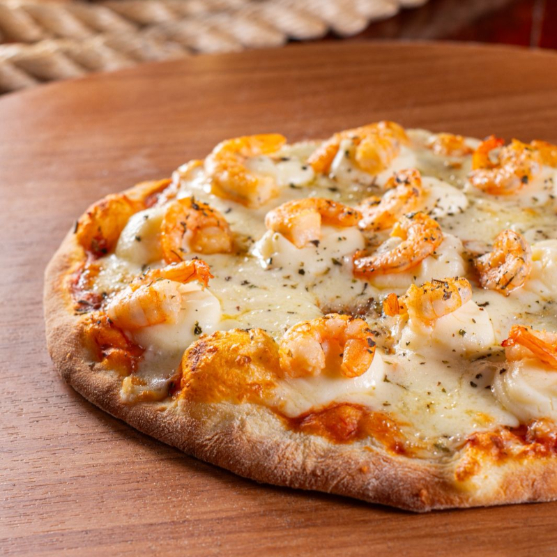 Massa artesanal, molho de tomate, mussarela, fatias de bacon, milho verde, molho barbecue e orégano.