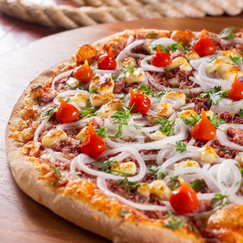 Massa artesanal, molho de tomate, mussarela, calabresa fatiada, cebola em rodelas e orégano.