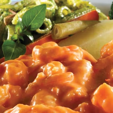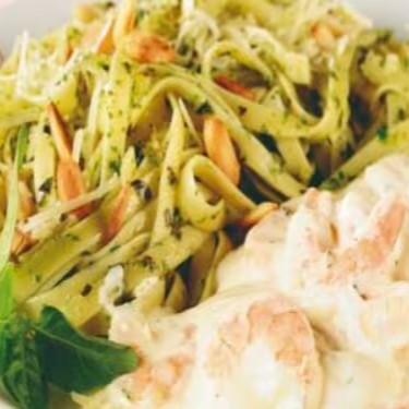 Filé de camarão puxado na manteiga e coberto com o encorpado molho de requeijão e ervas. Dois acompanhamentos a sua escolha.