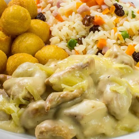 Cubos de filé de frango em molho de queijos.
