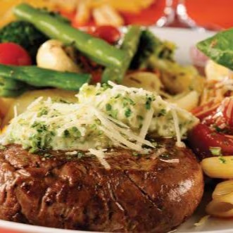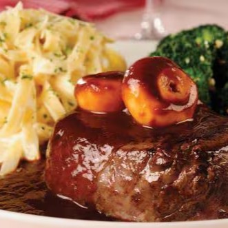 Corte bovino (Filé Mignon ou Steak) regado ao molho marsala (tipo madeira).
