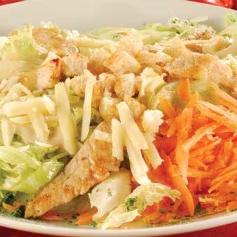Alface americana, parmesão e cenoura ralados, croutons e frango em tiras. Regada ao molho ceasar's.