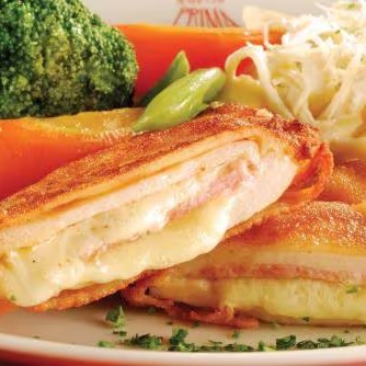 Filé de frango empanado e recheado com presunto e mussarela.