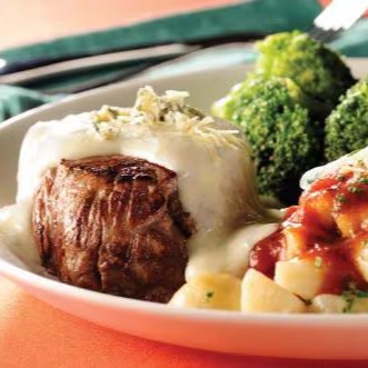Corte bovino (Filé Mignon ou Steak) ao molho de queijo gorgonzola.