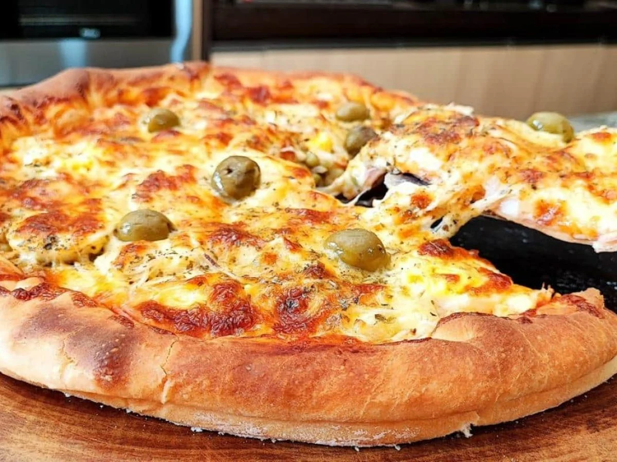 Massa artesanal, molho italiano, mussarela, presunto, azeitonas e orégano.