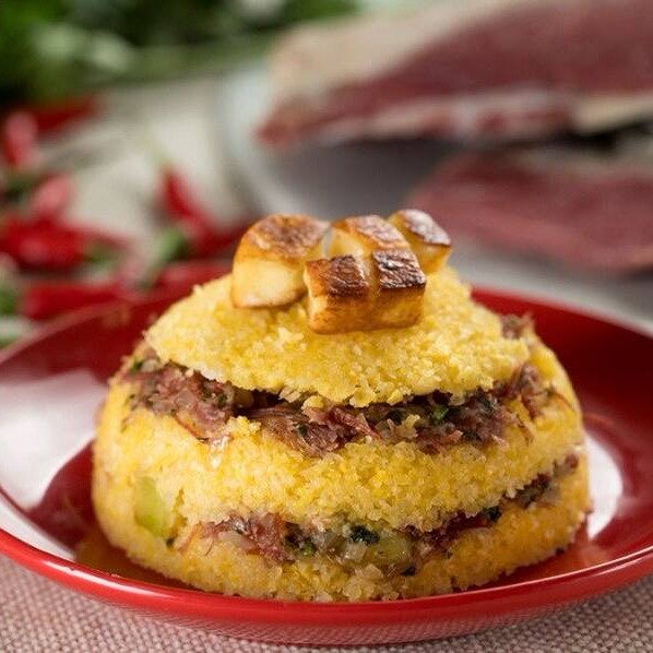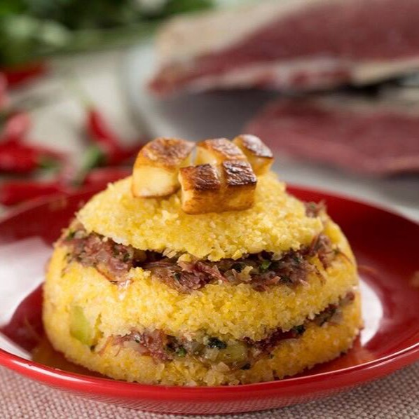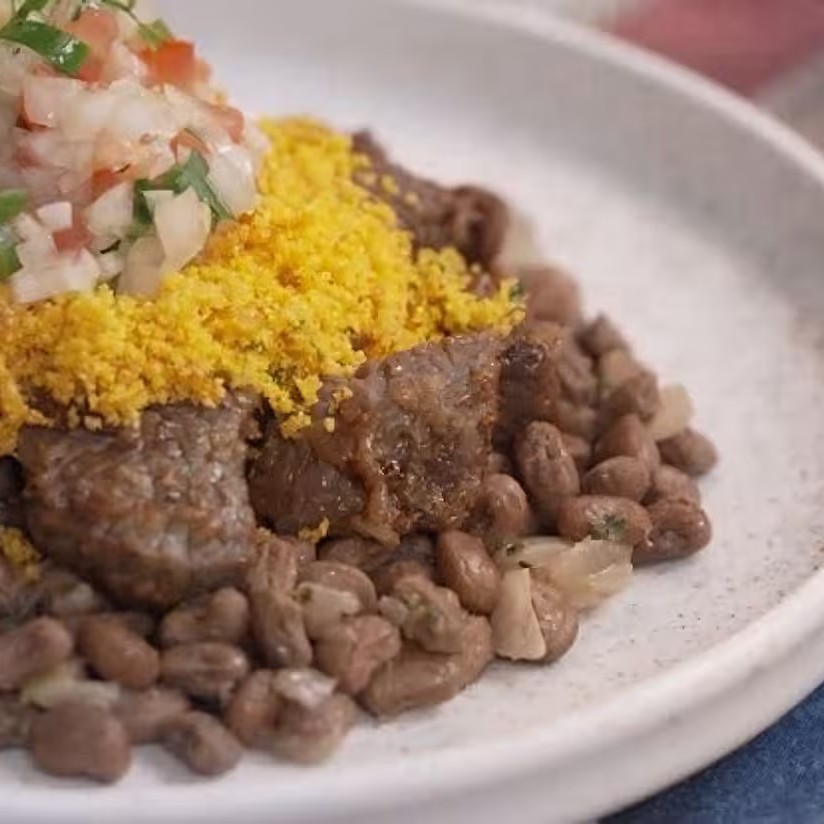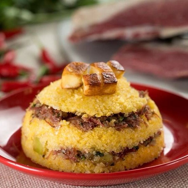 Pão bola, carne bovina, bacon, queijo mussarela, tomate, cebola, alface, batata palha, milho e ervilha.