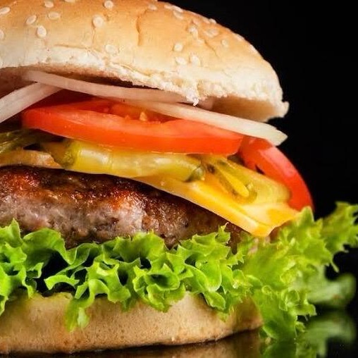 Pão bola, carne bovina, tomate, cebola, alface, batata palha, milho e ervilha.