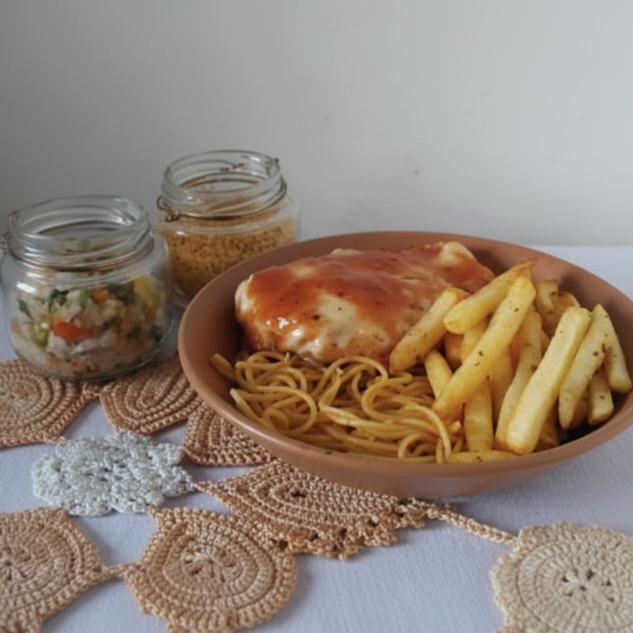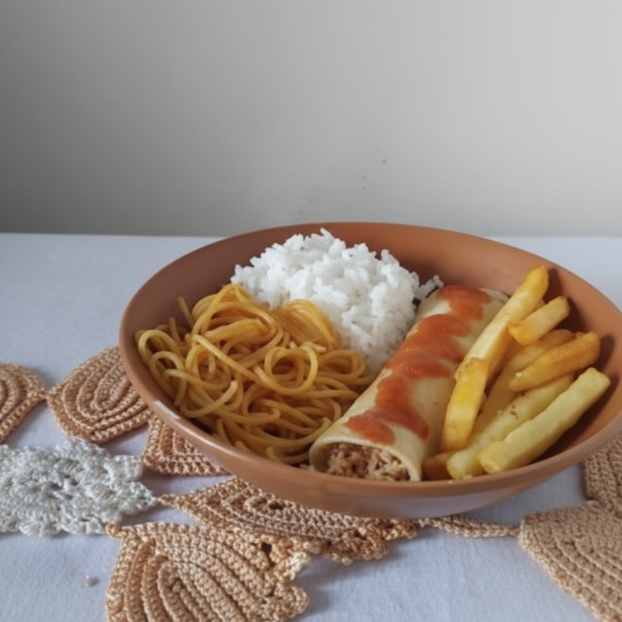 Acompanha arroz, macarrão e batata frita.