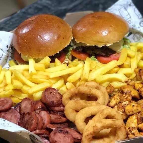 Batata frita, anel de cebola, frango, calabresa e 2x burguer.