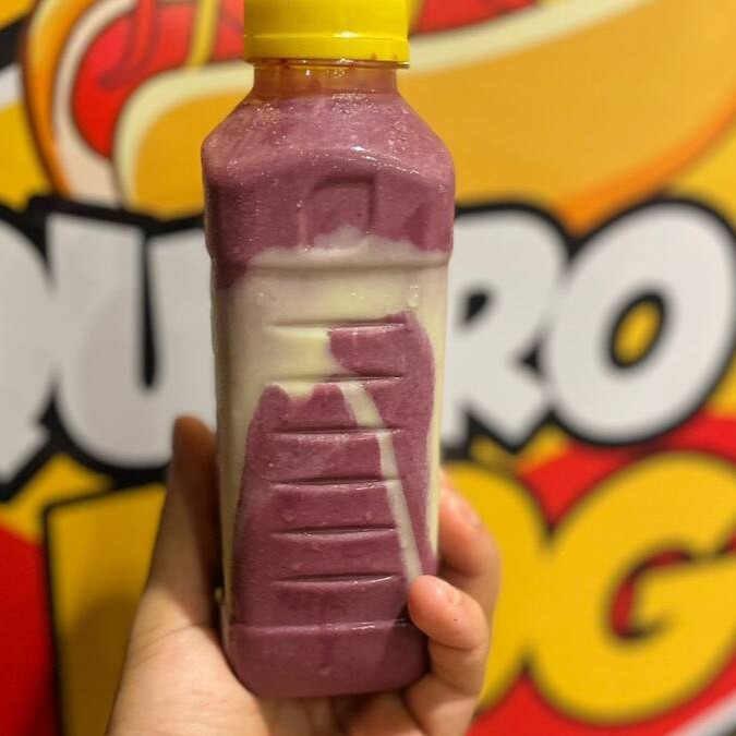 Açai batido na garrafinha, leite em pó, leite condensado e banana.