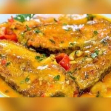 Peixe delicioso corvina posta ao molho de coco e bredo com arroz ou espaguete + batata palha