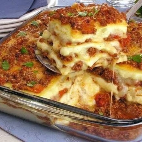Lasanha , macarrão ,molho de tomate , carne moida , queijo mussarela , molho branco , uma delicia muito bem servida da água na boca