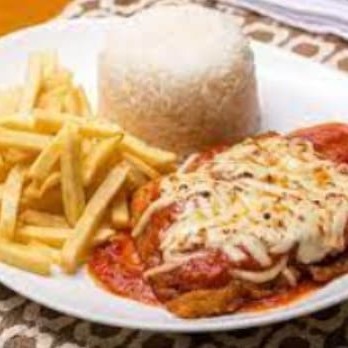 Arroz , carne empanado com molho e queijo mussarela derretido com orégano e queijo ralado + batata frita