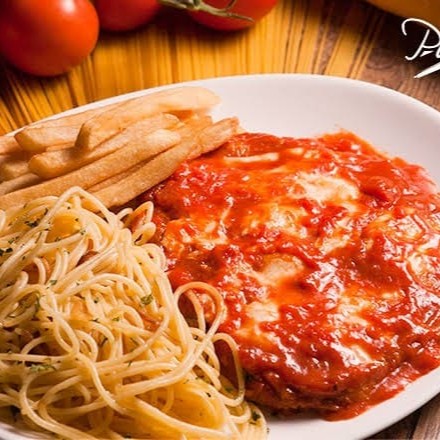 Filé de frango à parmegiana com molho especial, macarrão, espaguete, oregano, bastante queijo e queijo ralado