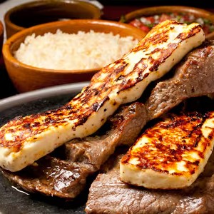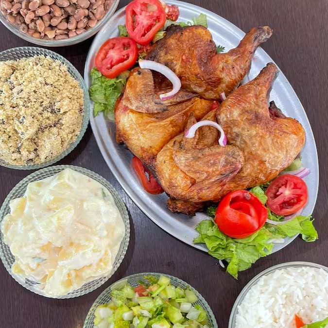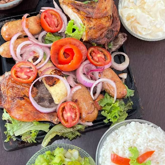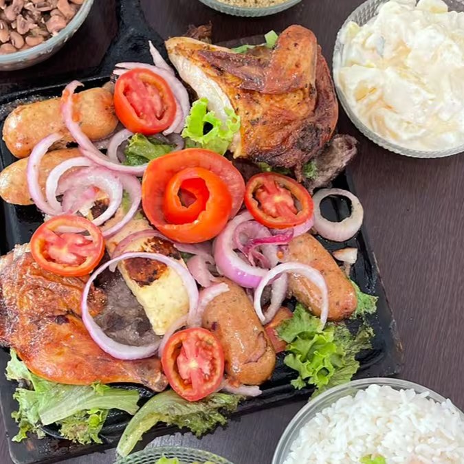 Galeto, Churrasco, Carne de Sol, Toscana, Queijo coalho acompanhados com arroz, feijão, batata com maionese, vinagrete e farofa