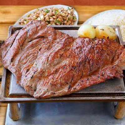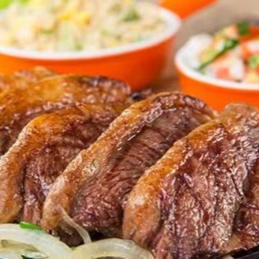 400g de Picanha Nacional acompanhados com arroz, feijão, batata com maionese, vinagrete e farofa