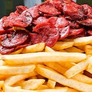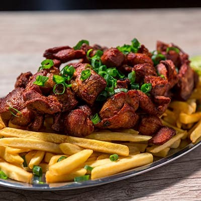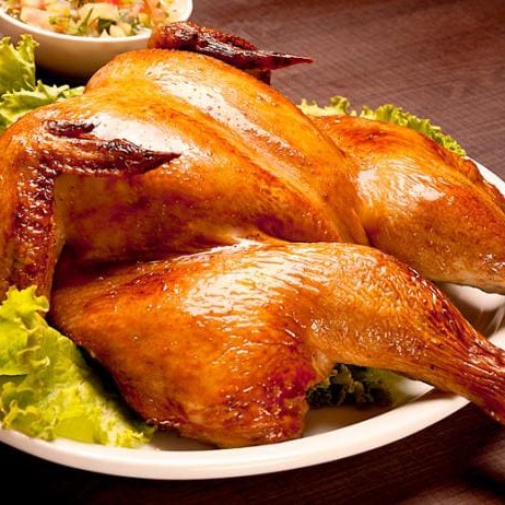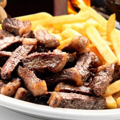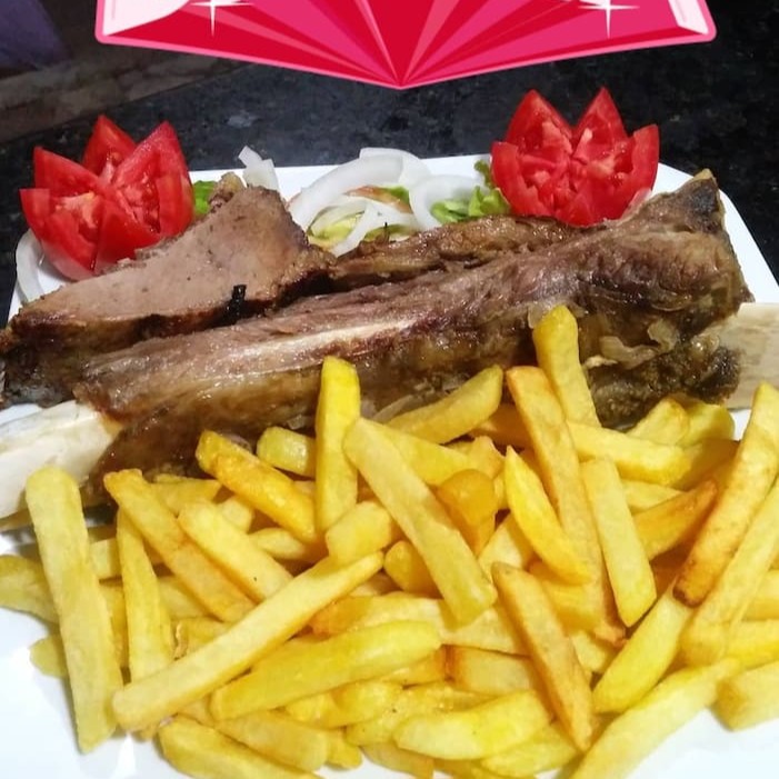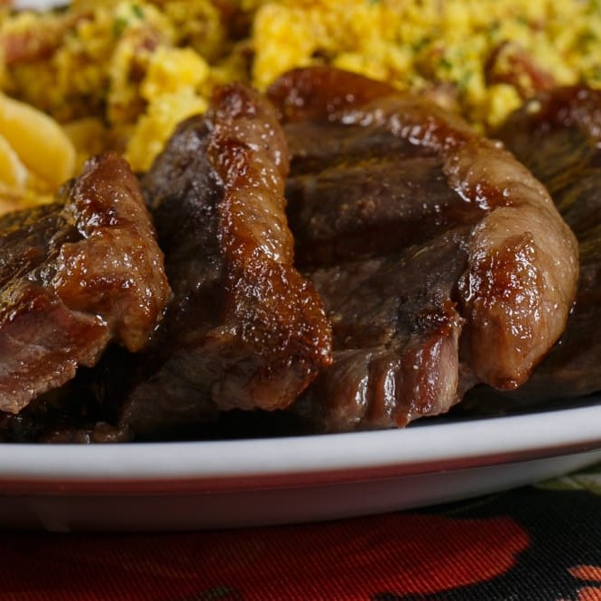 Acompanha arroz, feijão, batata com maionese, vinagrete e farofa.