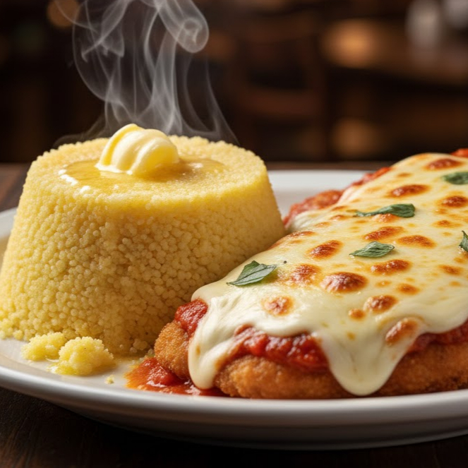 Cuscuz na manteiga , a parmegiana de frango com bastante queijo