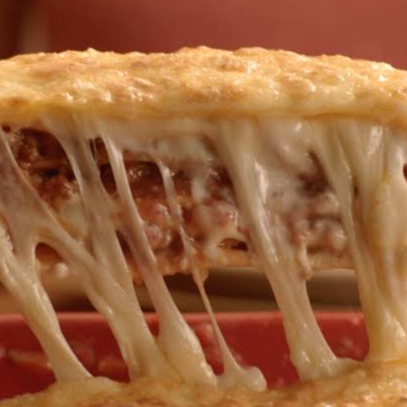 Massa de lasanha ao molho de tomate , carne moída com queijo mussarela presunto e muito queijo , orégano e queijo ralado