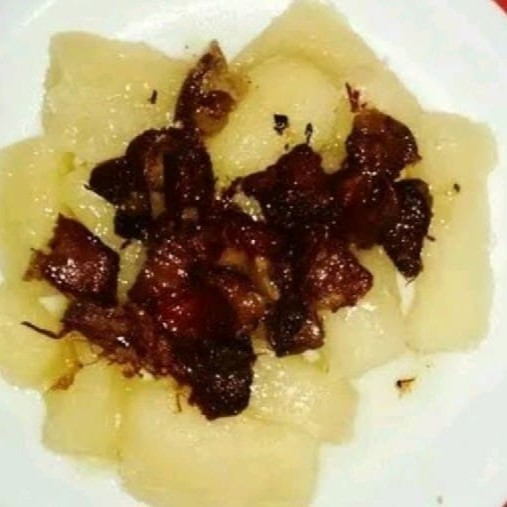 Macaxeira bem molinha, amanteigada com calabresa frita acebolada