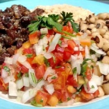 Feijão macassa, arroz, vinagrete, Farofa, charque
