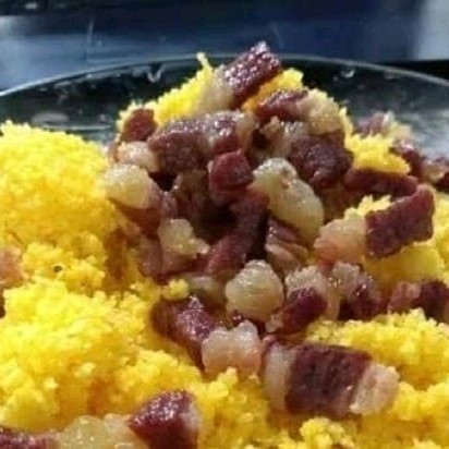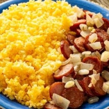 Cuscuz amanteigado com calabresa frita acebolada