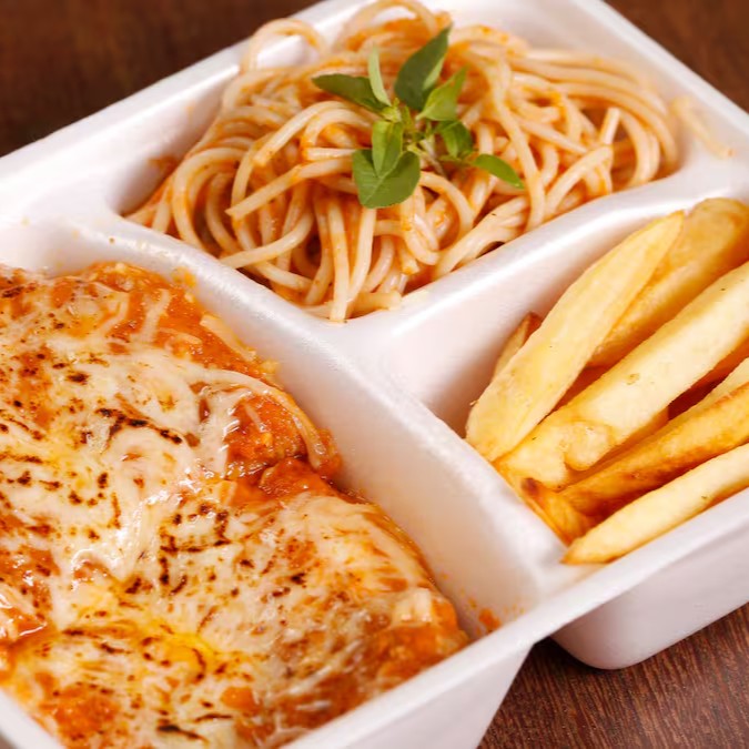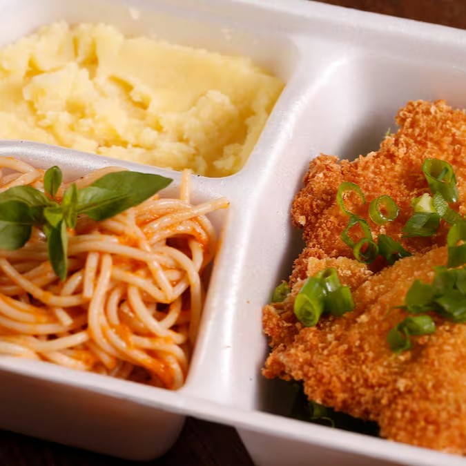Acompanha: espaguete ao molho de tomate e purê de batata inglesa.