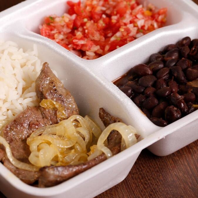 Acompanha: Arroz branco, feijão preto e vinagrete.