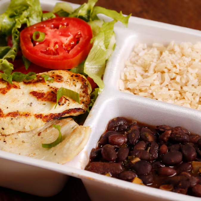 Acompanha: Arroz integral, feijão preto e salada mista.