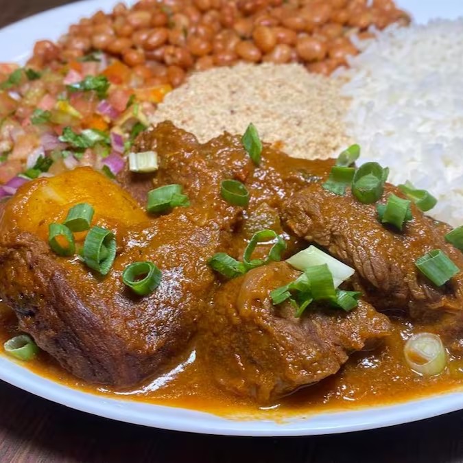 Carne de panela guisada com batatas, acompanhada de: arroz branco, feijão mulato e vinagrete.