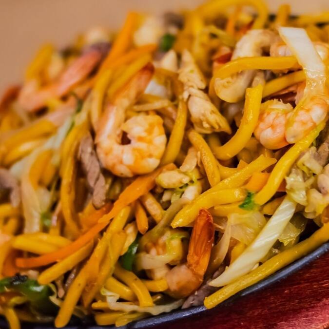 Suculento Macarrão Frito na Chapa, Camarão, Carne, Frango, Cenoura, Pimentão, Acelga com Molho Especial da Casa.