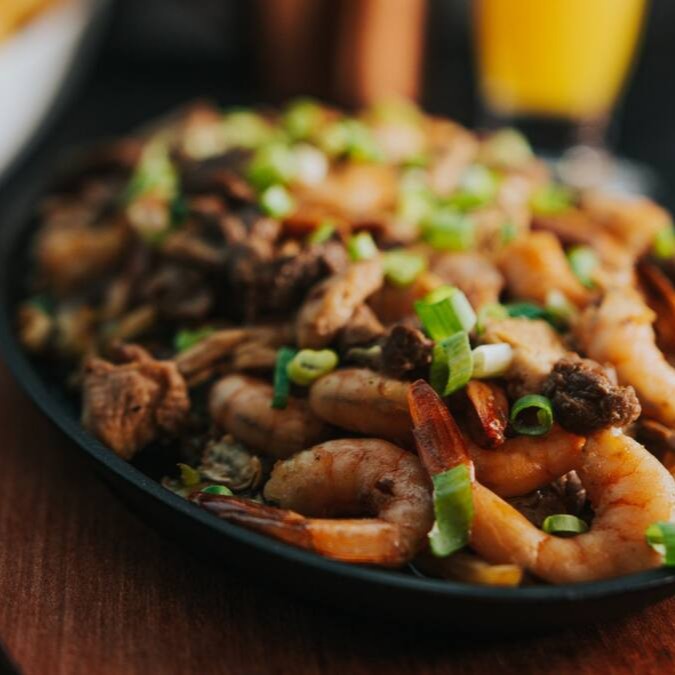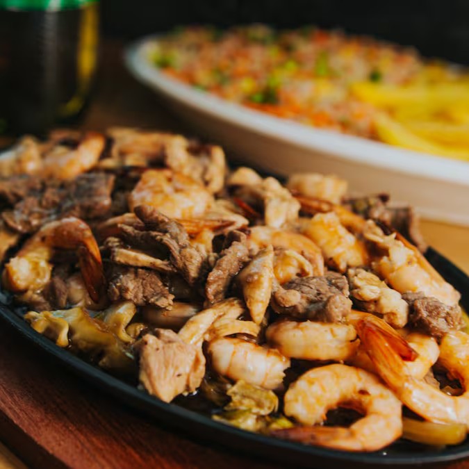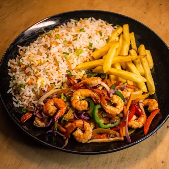 Delicioso Camarão, Carne, Frango, Cenoura, Cebola, Pimentão, Acelga com Molho Especial da Casa, Arroz Chop Suey e Batata Frita.