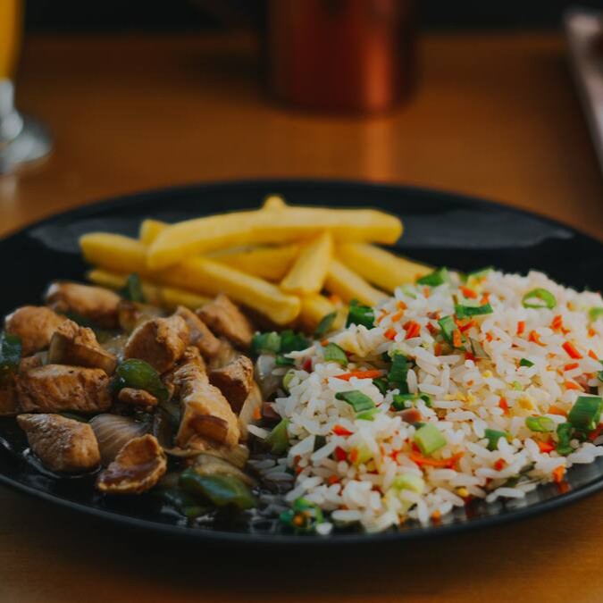 Suculento Frango em Cubos, Pimentão, Cebola com Molho Especial da Casa, delicioso Arroz Chop Suey e Batata Frita.