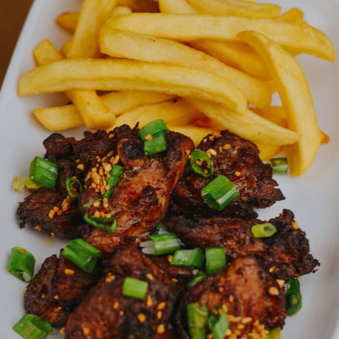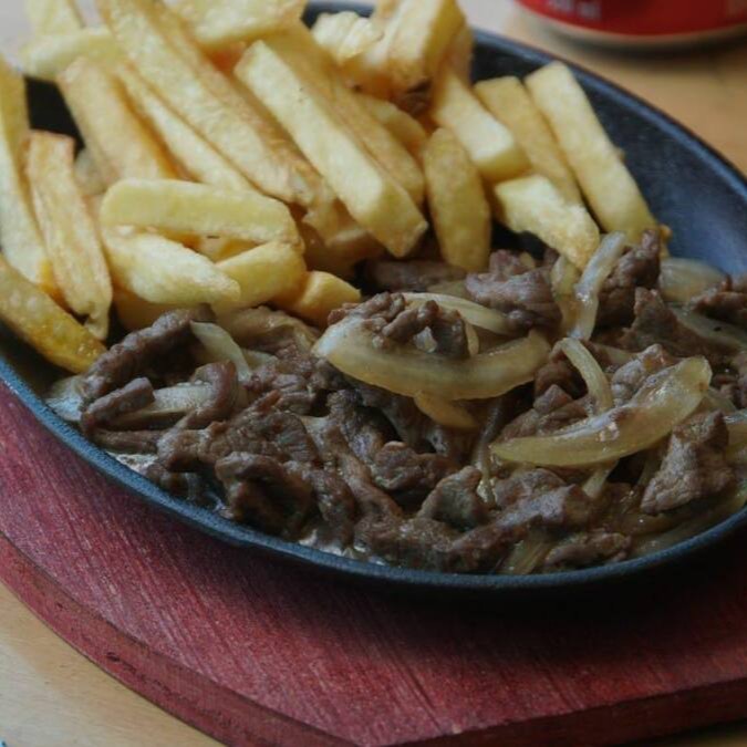 Suculenta Porção de Carne em Tiras acompanhado de Fritas Crocante.