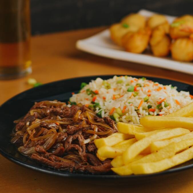 Deliciosa Carne em Tiras, Cebolas em Tiras com Curry, acompanhada de Arroz Chop Suey e Batata Frita.