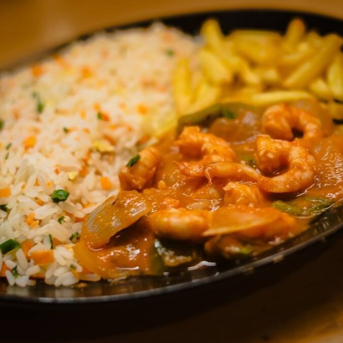 Delicioso Camarão com Molho de Tomate da Casa, Cebola e Pimentão, acompanhando Arroz Chop Suey e Batata Frita.