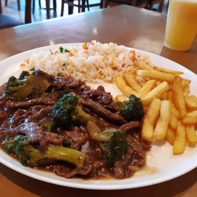 Deliciosa Carne em tiras, Brócolis com molho especial da casa. Acompanhada de Arroz Chop Suey e Batata Frita.