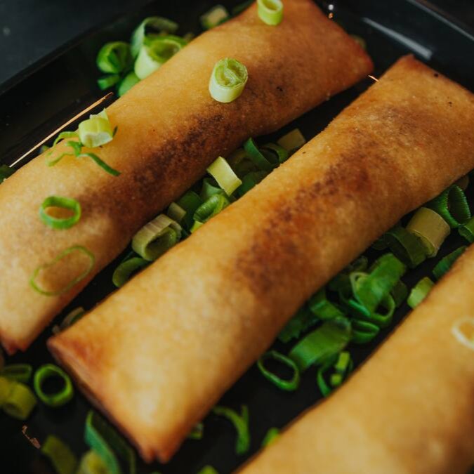 Frito e Cebolinha, acompanhado de Arroz Chop Suey e Batata Frita.