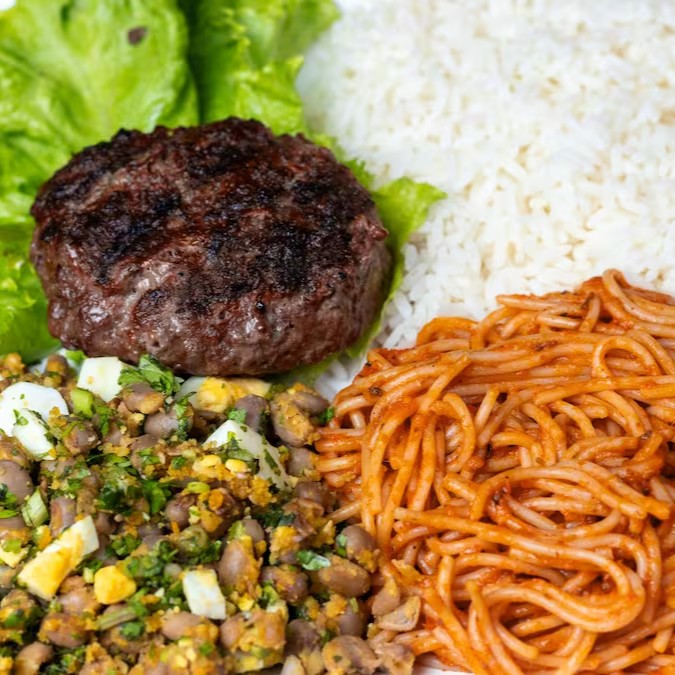 Marmita com carne de costela em forma de hamburguer, acompanhando de arroz soltinho, feijão com farofa de ovos e macarrão ao molho artesanal.