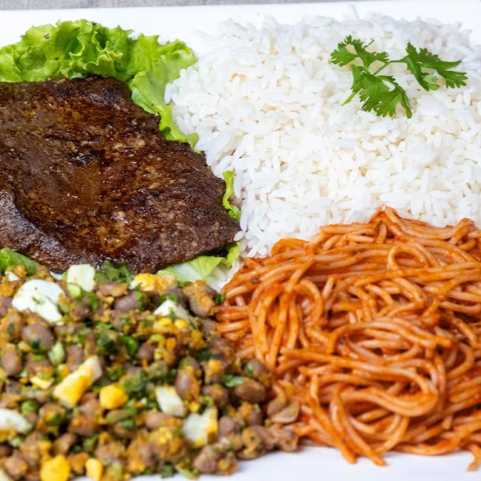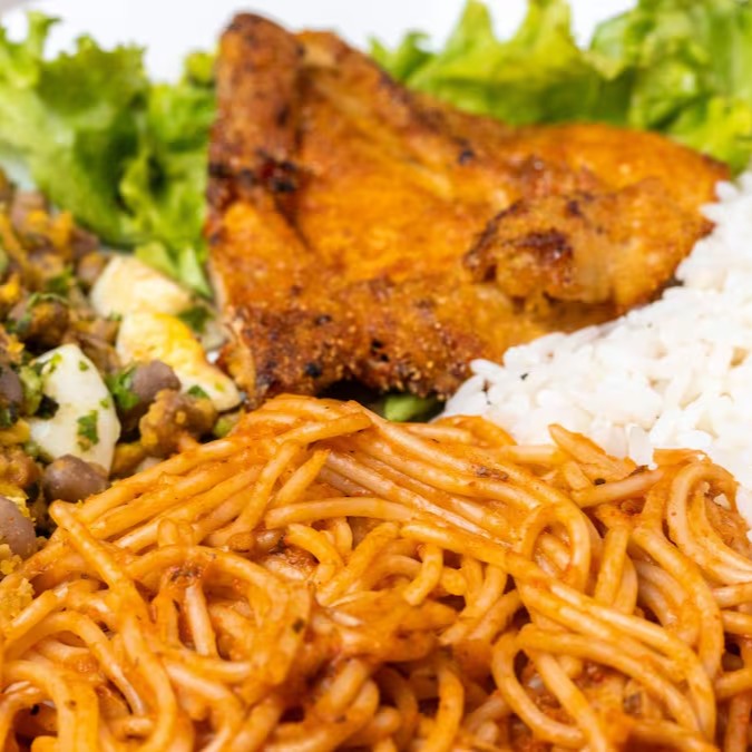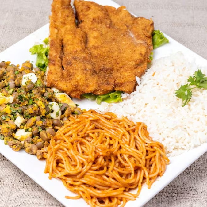 Peito de frango a milanesa, acompanhando de arroz soltinho, feijão com farofa de ovos e macarrão ao molho artesanal.