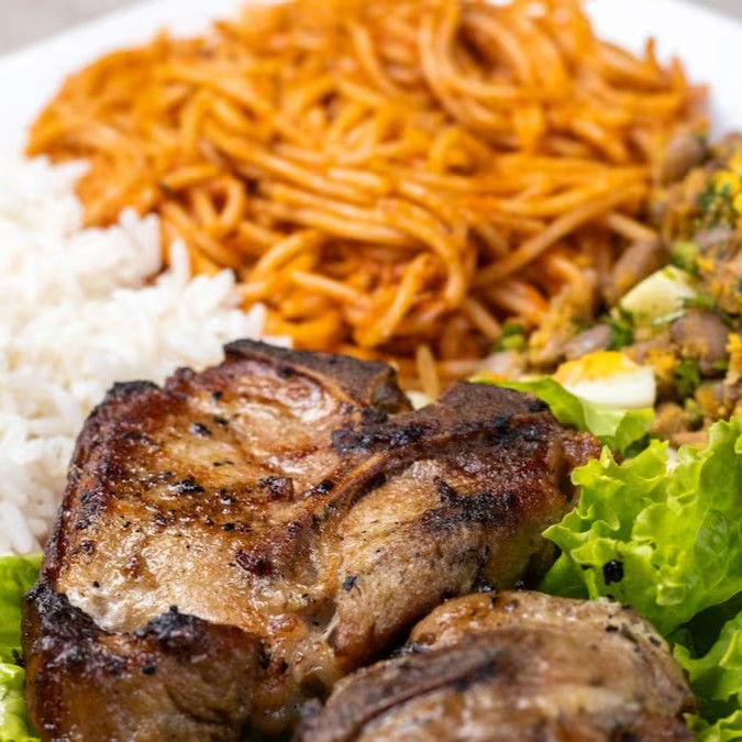 Marmita completa recheada com cortes de bisteca suína, acompanhando de arroz soltinho, feijão com farofa de ovos e macarrão ao molho artesanal.