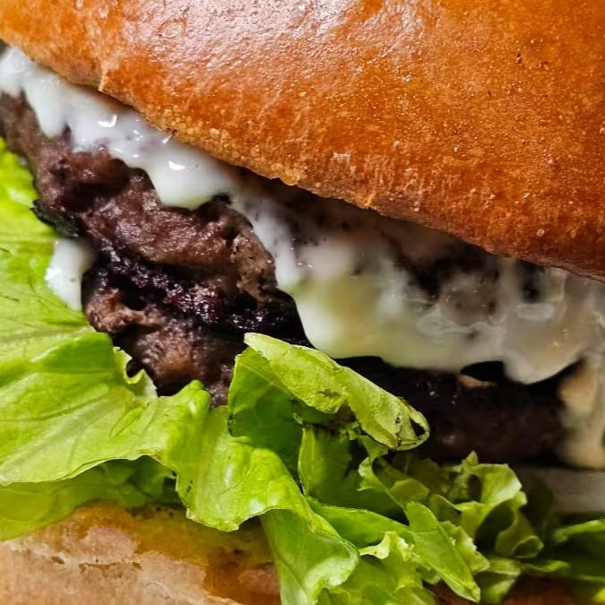 Pão, Hamburguer artesanal na brasa, queijo cheddar, salada e maionese da casa