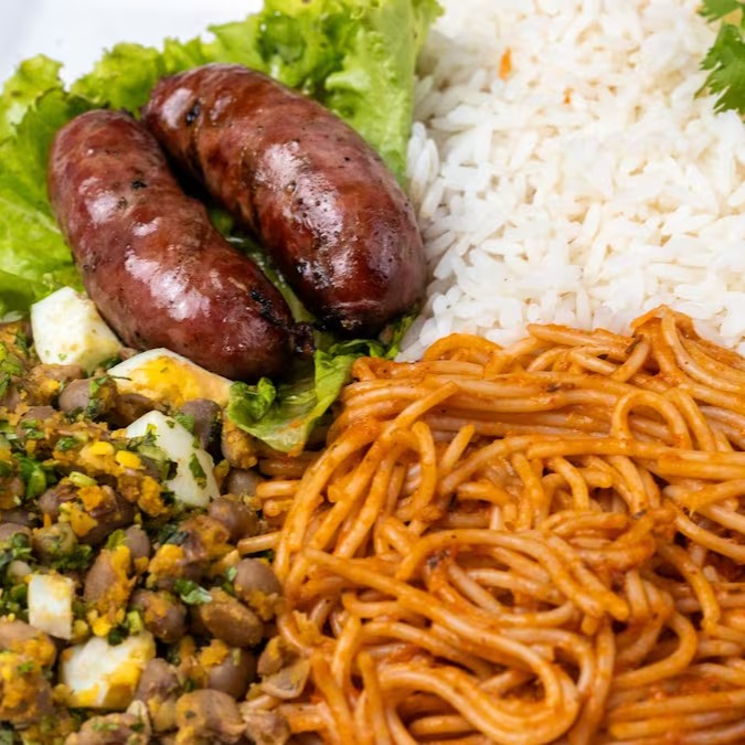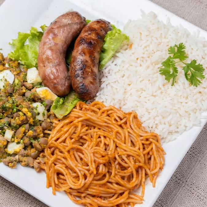 Marmita completa de linguiça suína na brasa(2unds) acompanhando de arroz soltinho, feijão com farofa de ovos e macarrão ao molho artesanal.