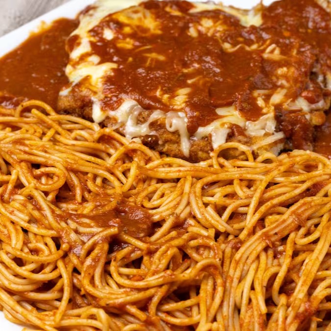 Marmita completa de frango a parmegiana acompanhanda de macarrão ao molho artesanal e queijo gratinado