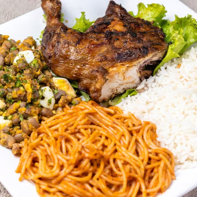 Galeto na brasa,servido com arroz, feijão com farofa de ovos e macarrão.
