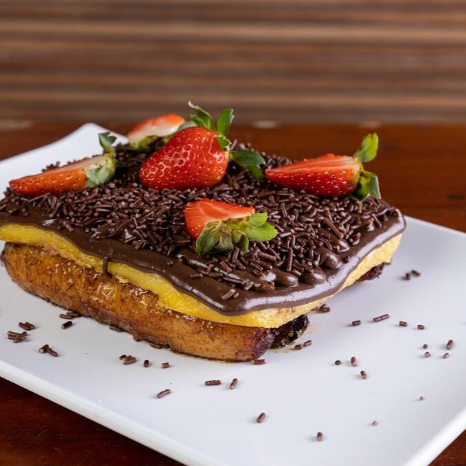 Banana , queijo manteiga, brigadeiro e morango